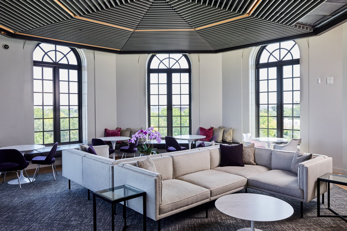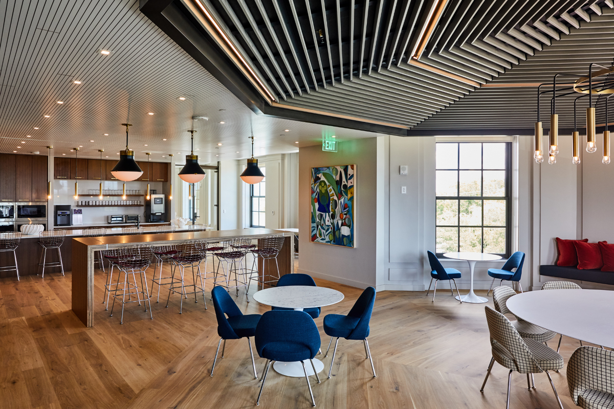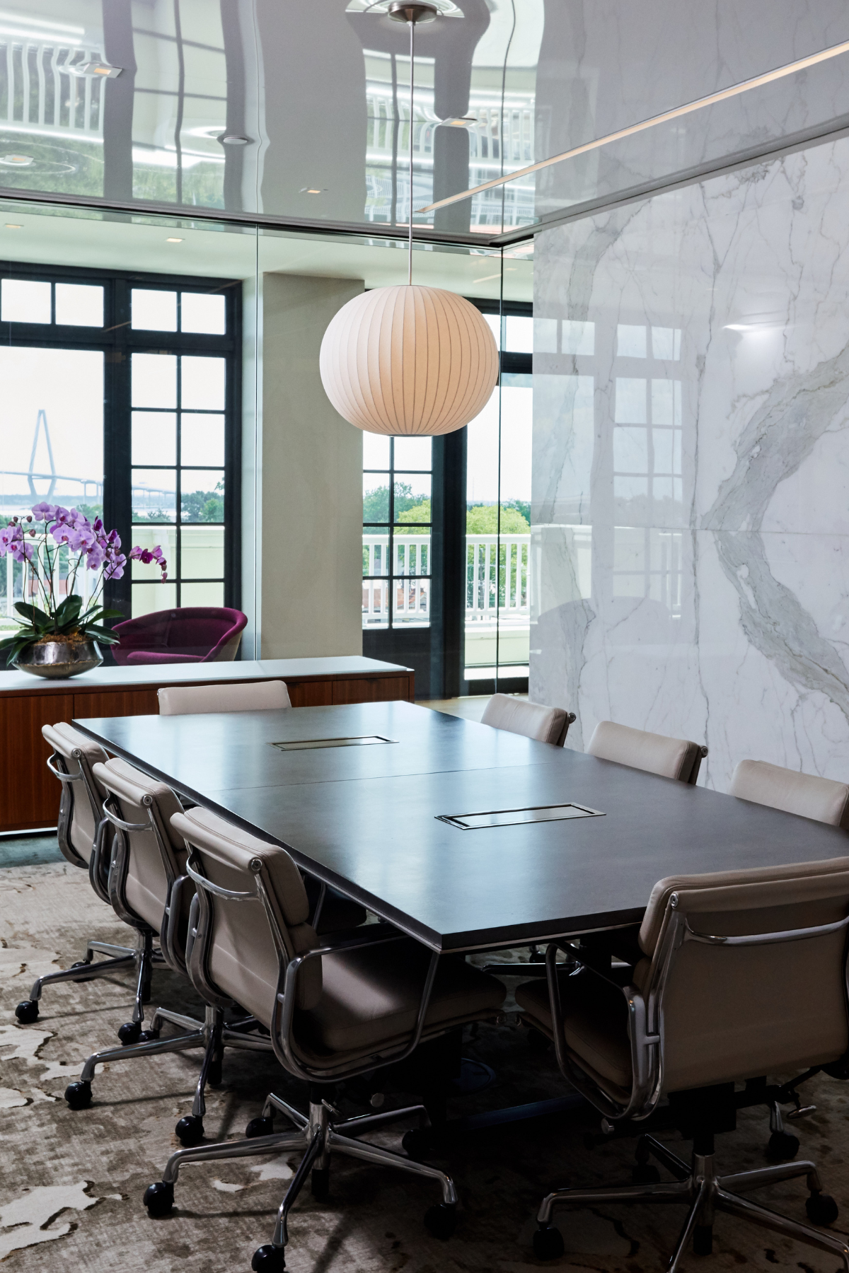 This 4-level headquarters, located in the heart of historic downtown Charleston, features a stunning spiral staircase that connects three floors of top-tier office space. The sweeping staircase is finished with a Venetian plaster shell and a white oak core, serving as a central design feature. This focal point is complemented by an extensive collection of artwork, including pieces by Charleston-native artist William M. Halsey. Italian-made glass partitions from Adotta enhance the clean aesthetic and provide a sleek backdrop for classic mid-century furniture pieces throughout.