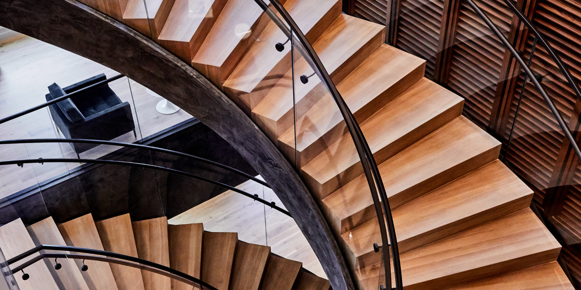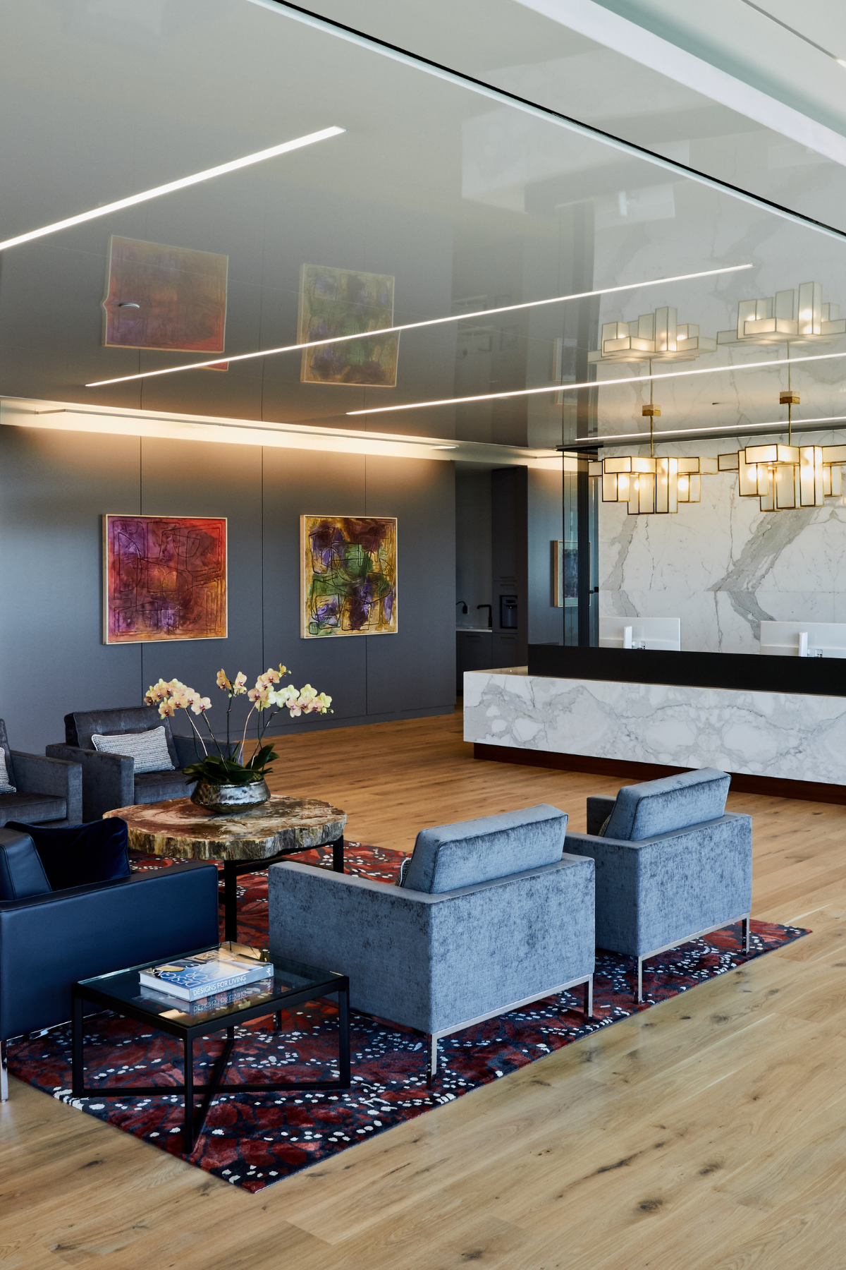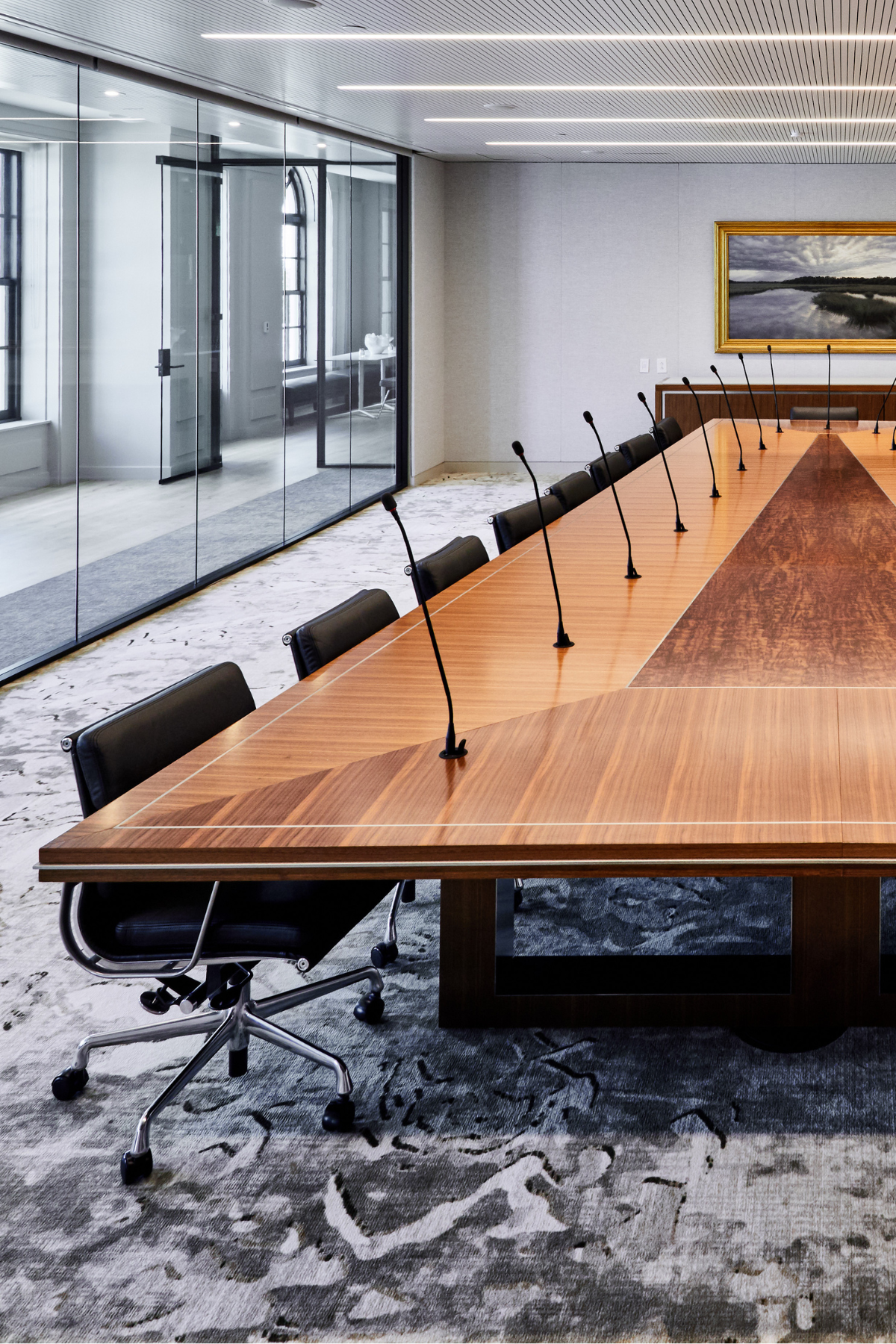 This 4-level headquarters, located in the heart of historic downtown Charleston, features a stunning spiral staircase that connects three floors of top-tier office space. The sweeping staircase is finished with a Venetian plaster shell and a white oak core, serving as a central design feature. This focal point is complemented by an extensive collection of artwork, including pieces by Charleston-native artist William M. Halsey. Italian-made glass partitions from Adotta enhance the clean aesthetic and provide a sleek backdrop for classic mid-century furniture pieces throughout.