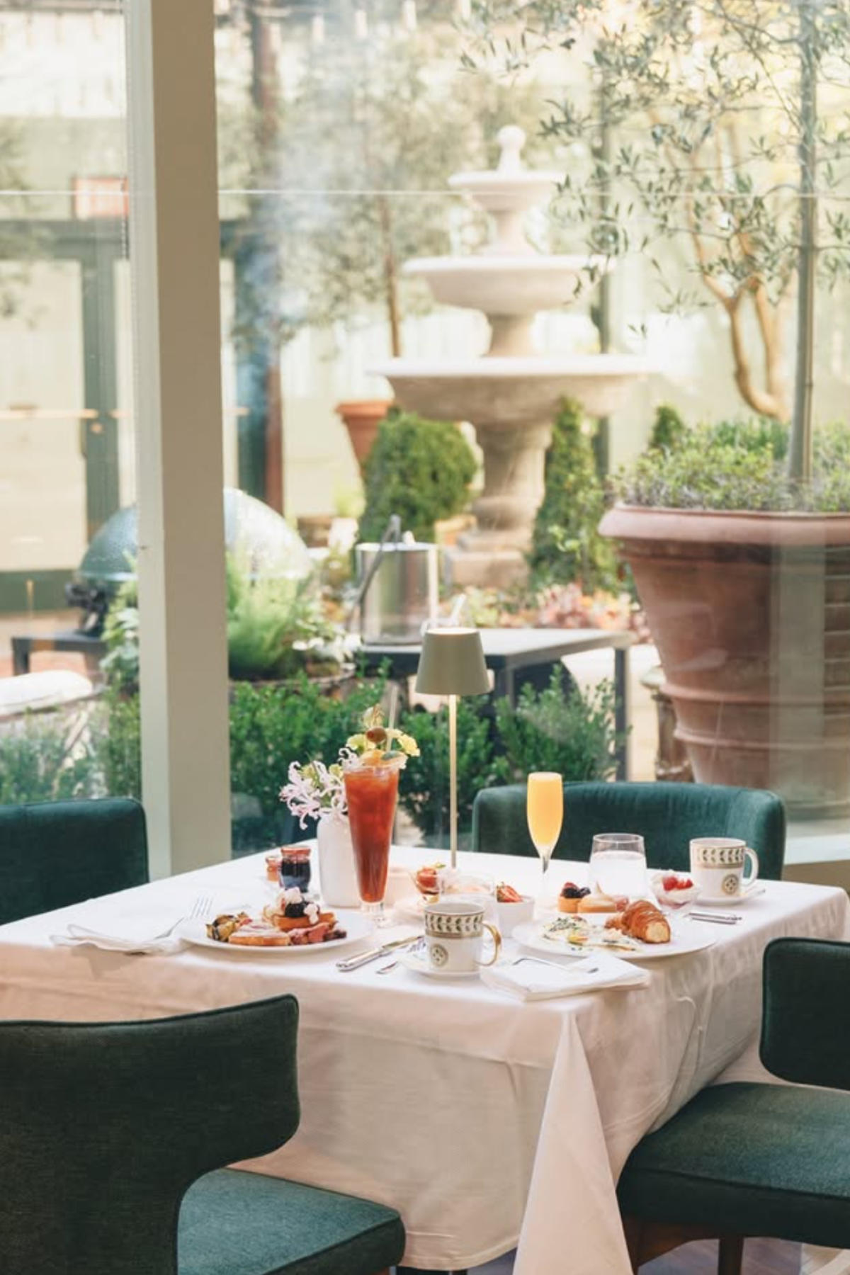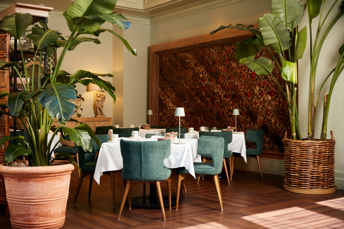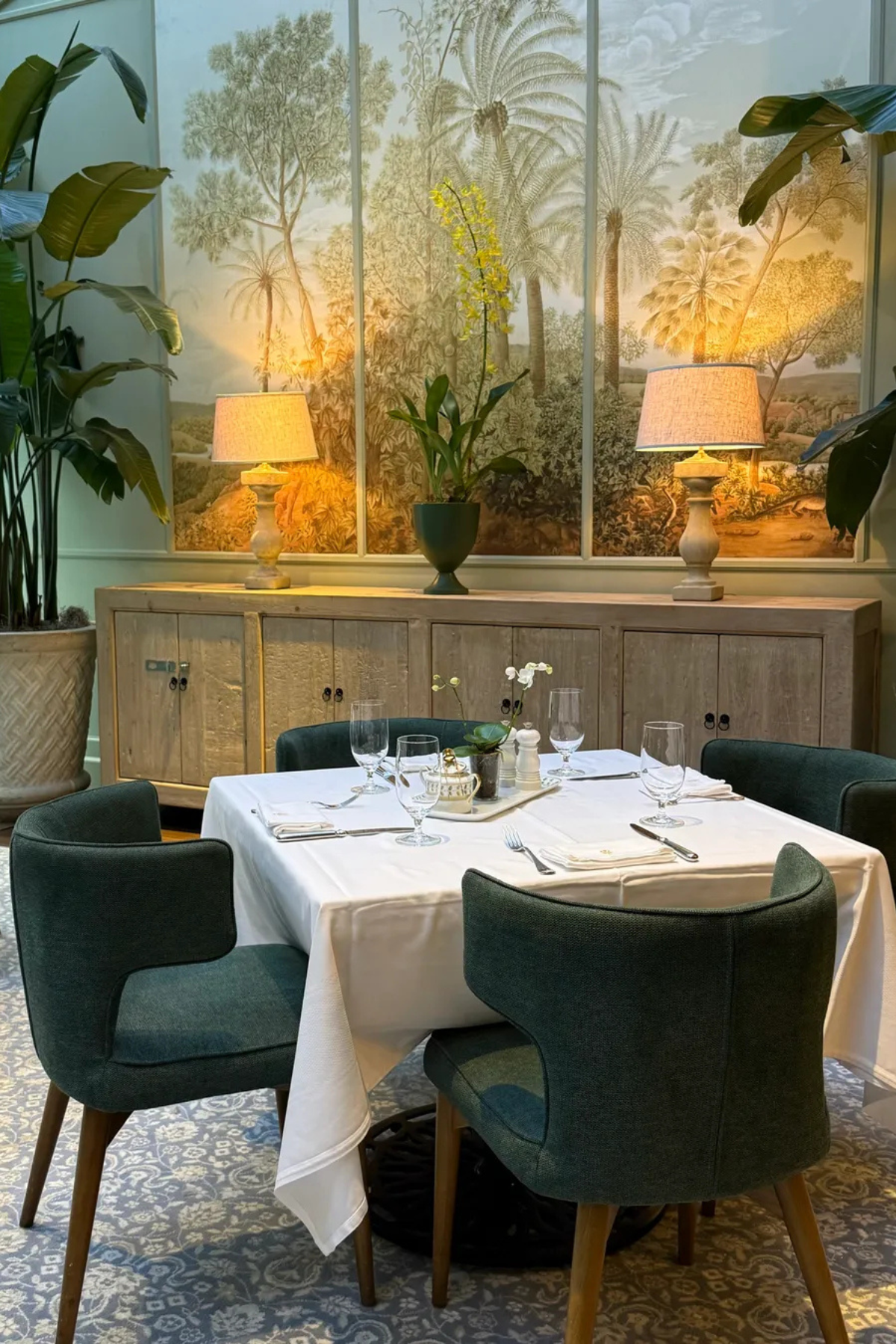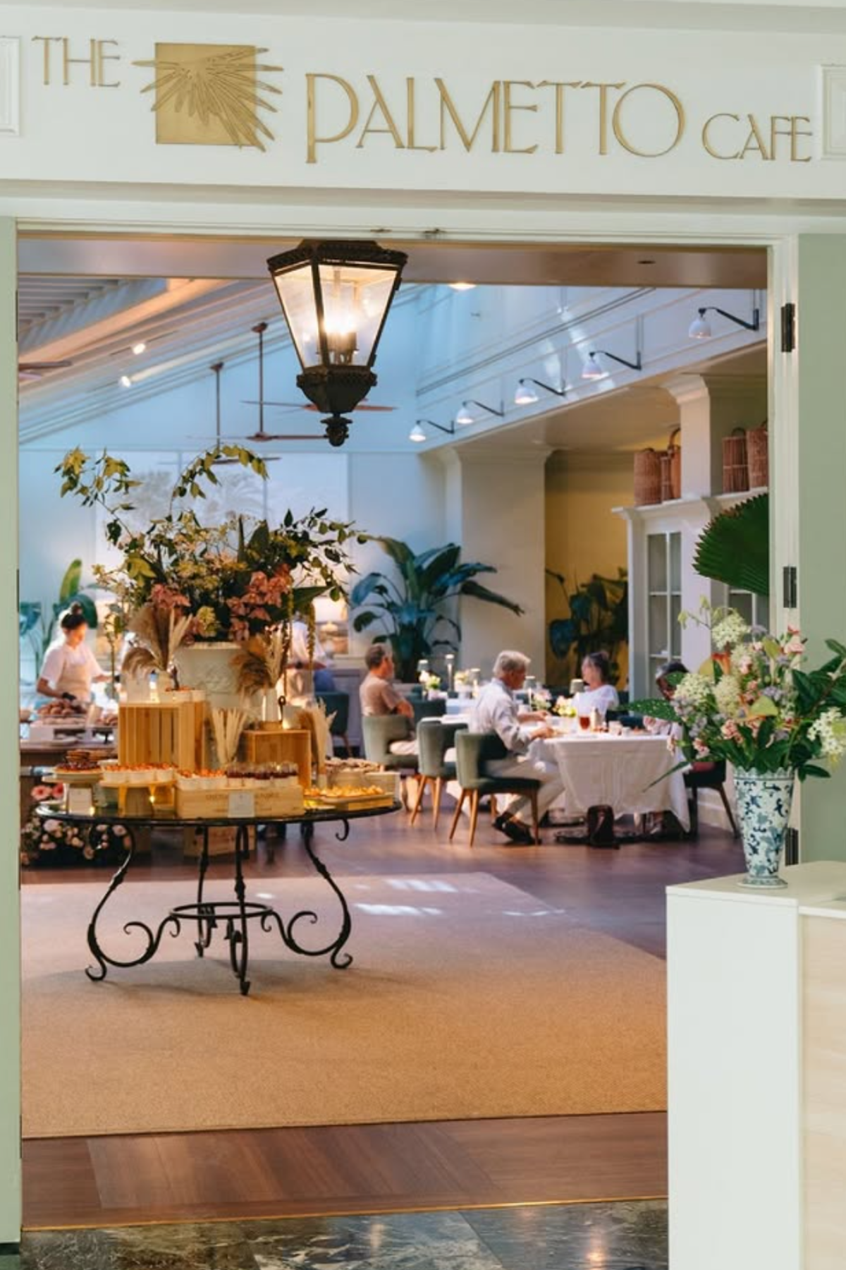 Located in the heart of The Charleston Place Hotel, the Palmetto Café, caters to guests for breakfast, lunch and private events. The cafe was reimagined by Elizabeth Stuart with a sophisticated Garden-inspired design that brings the breezy feel of the adjoining outdoor garden courtyard, inside.The café is anchored by a triptych of painted panels with soaring palm trees.Shades of green run throughout the space with accents of live foliage including tropical palms and plants. Intimate spaces were created throughout the dining area using both antique and contemporary furniture and accessories. Thoughtfully curated elements, including antique metal garden urns on stand, an oversized arched French bistro window mirrored to reflect the outside garden and an impressive framed painted “Rose Panel”, formerly the ceilingof an abandonedchurch in Italy, are all a nod to Charleston’s rich history of design.