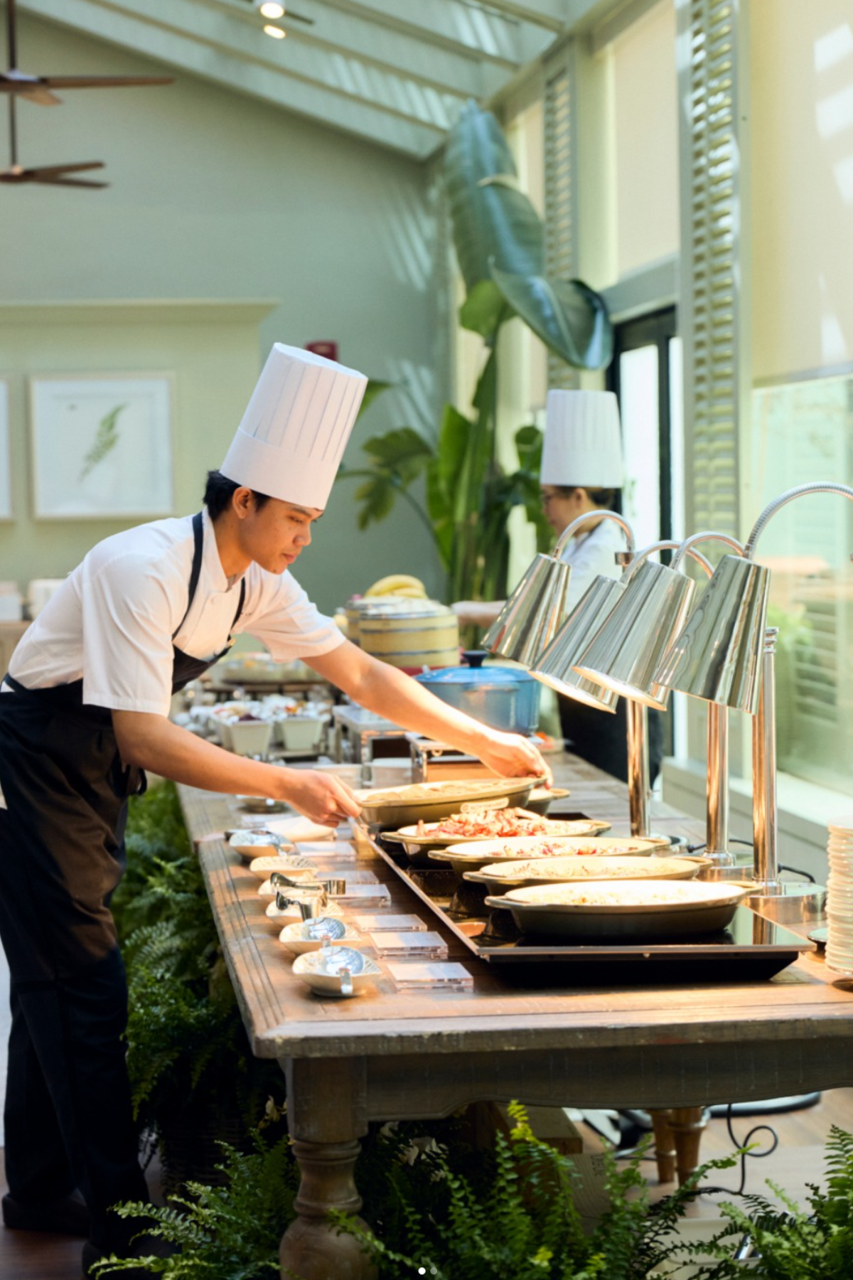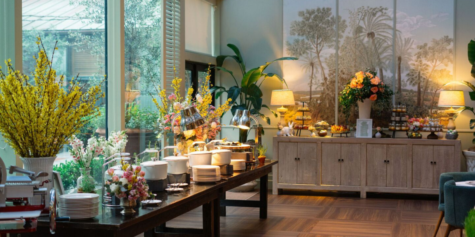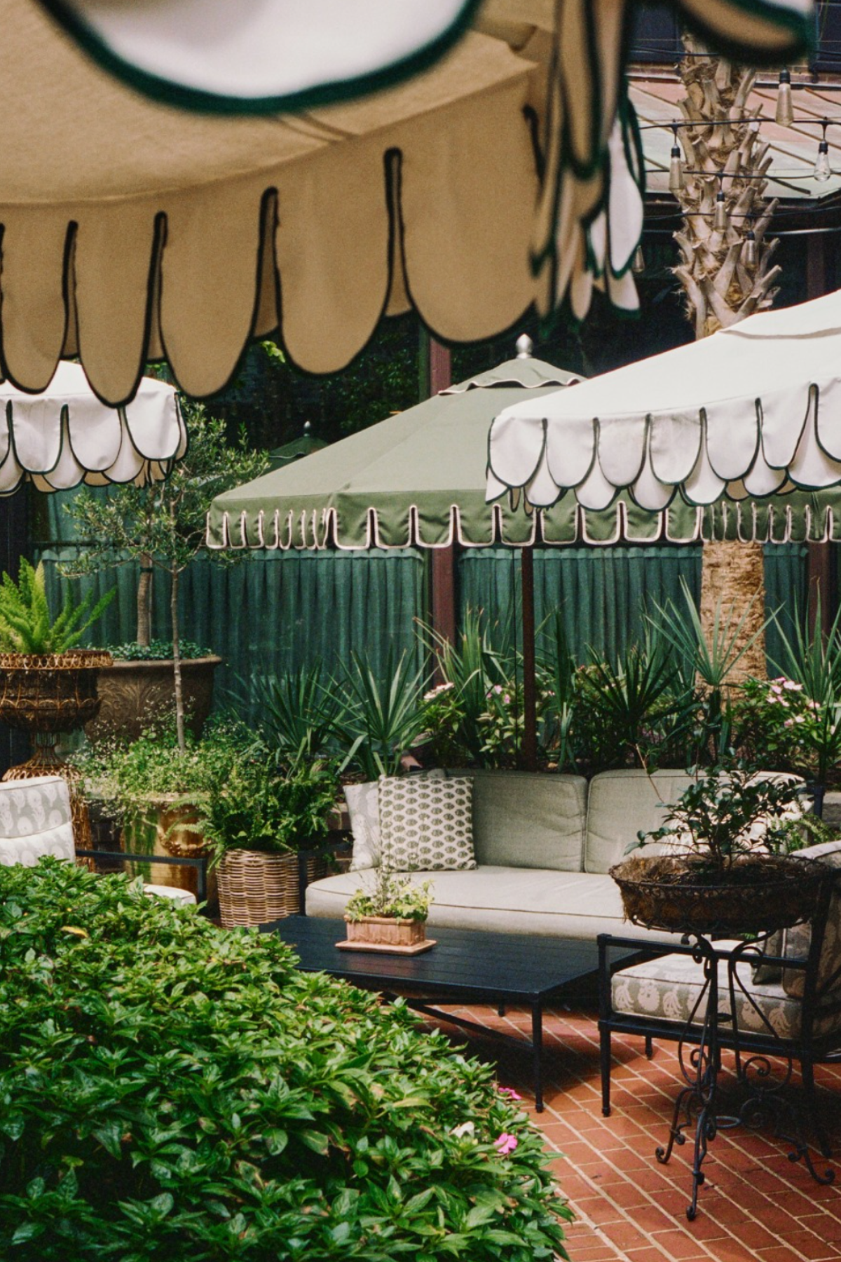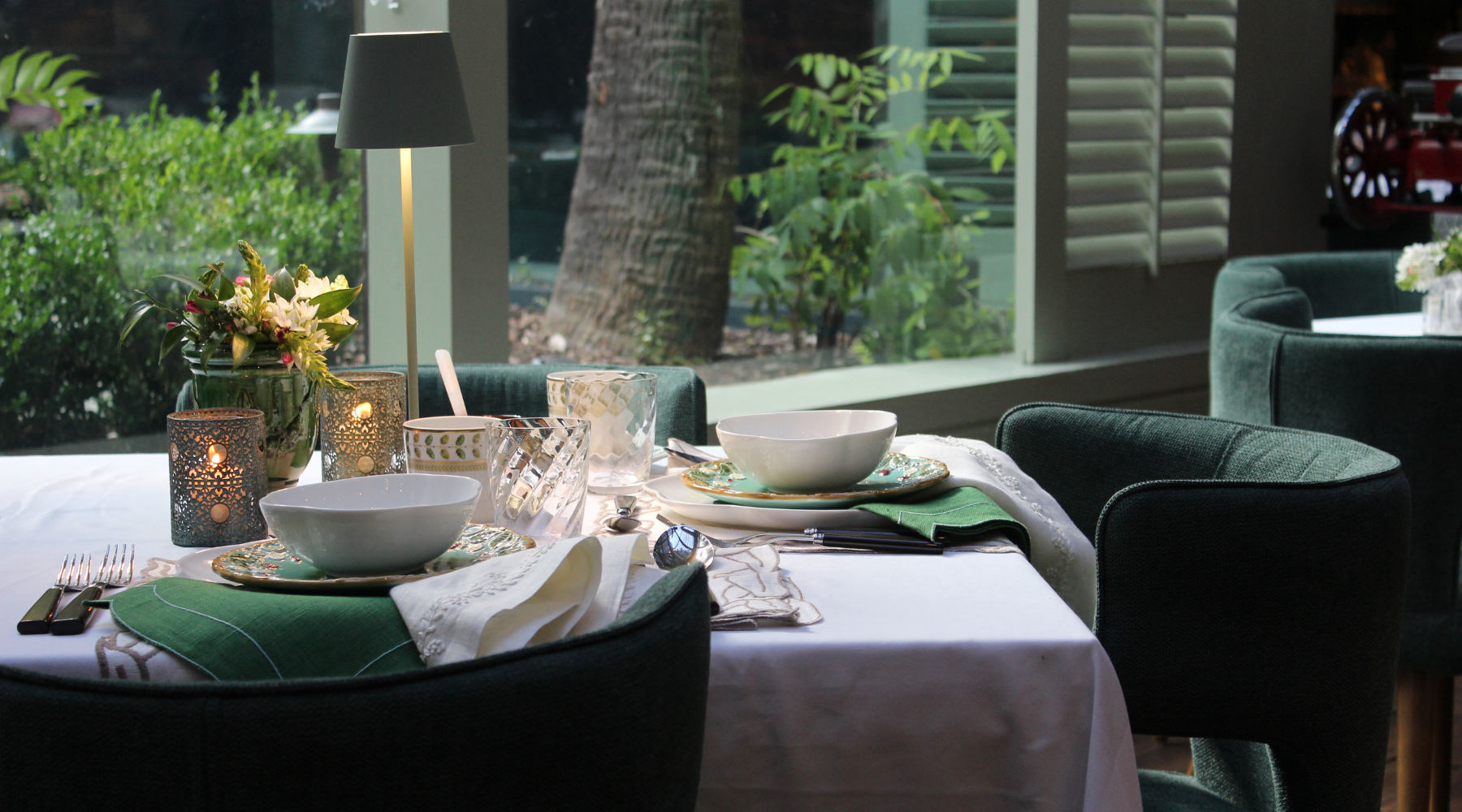 Located in the heart of The Charleston Place Hotel, the Palmetto Café, caters to guests for breakfast, lunch and private events. The cafe was reimagined by Elizabeth Stuart with a sophisticated Garden-inspired design that brings the breezy feel of the adjoining outdoor garden courtyard, inside.The café is anchored by a triptych of painted panels with soaring palm trees.Shades of green run throughout the space with accents of live foliage including tropical palms and plants. Intimate spaces were created throughout the dining area using both antique and contemporary furniture and accessories. Thoughtfully curated elements, including antique metal garden urns on stand, an oversized arched French bistro window mirrored to reflect the outside garden and an impressive framed painted “Rose Panel”, formerly the ceilingof an abandonedchurch in Italy, are all a nod to Charleston’s rich history of design.