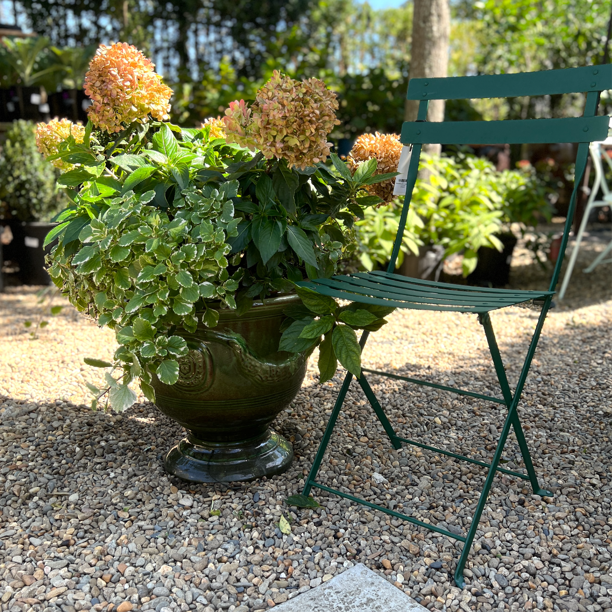 "Classically french, this bistro set comes in a few different colors and adds an inviting note to any outdoor patio, garden space or in a breakfast nook. We sell these often!"