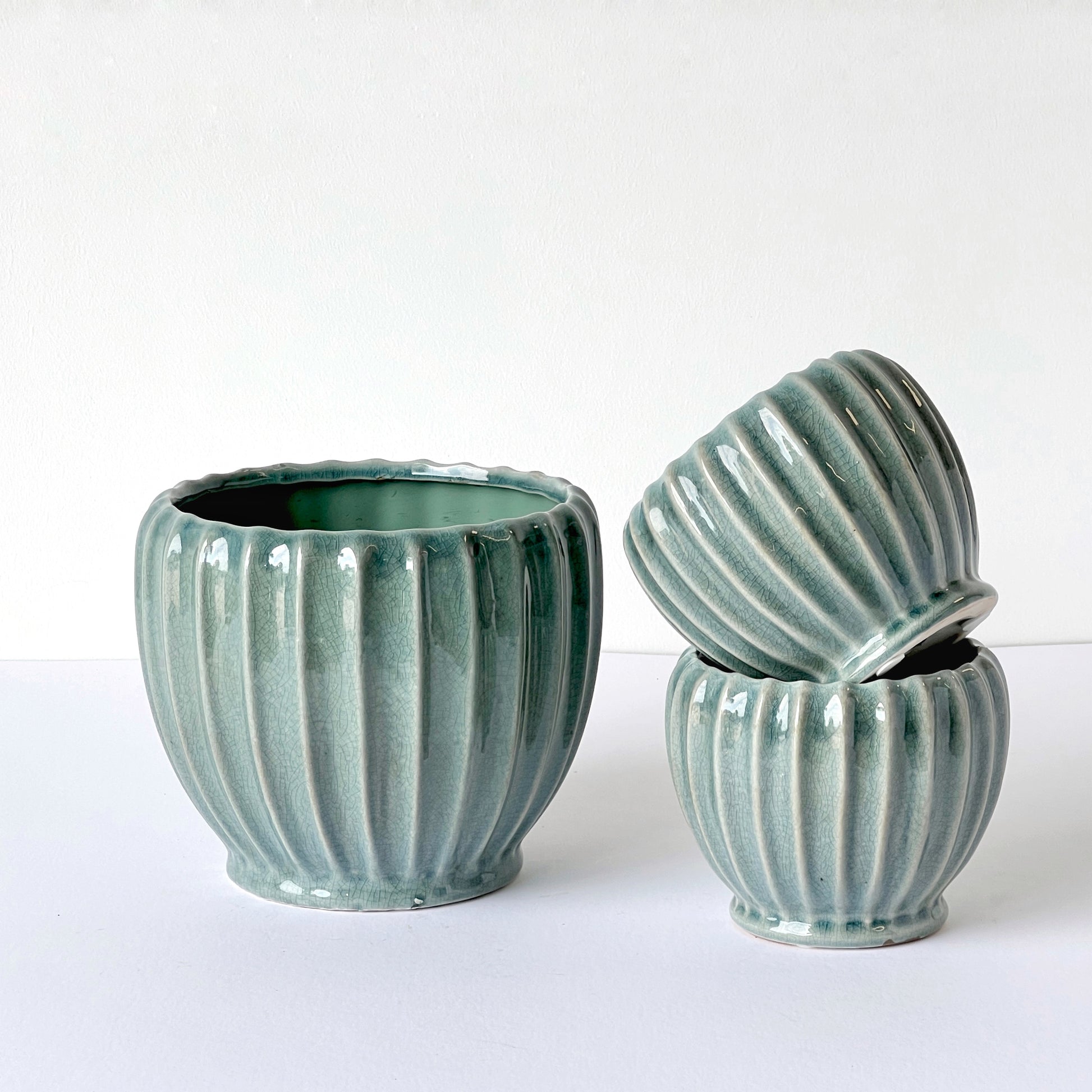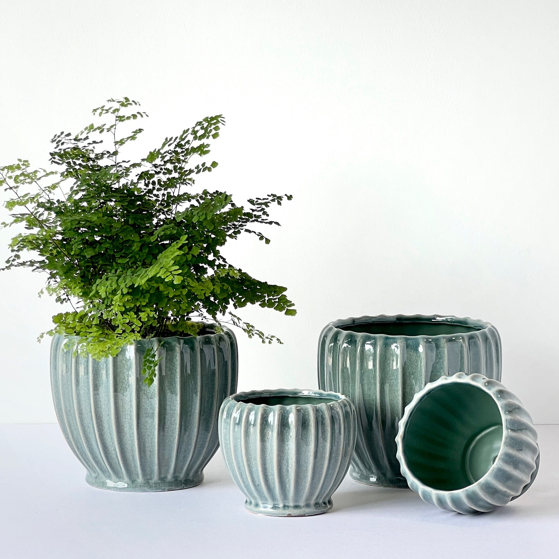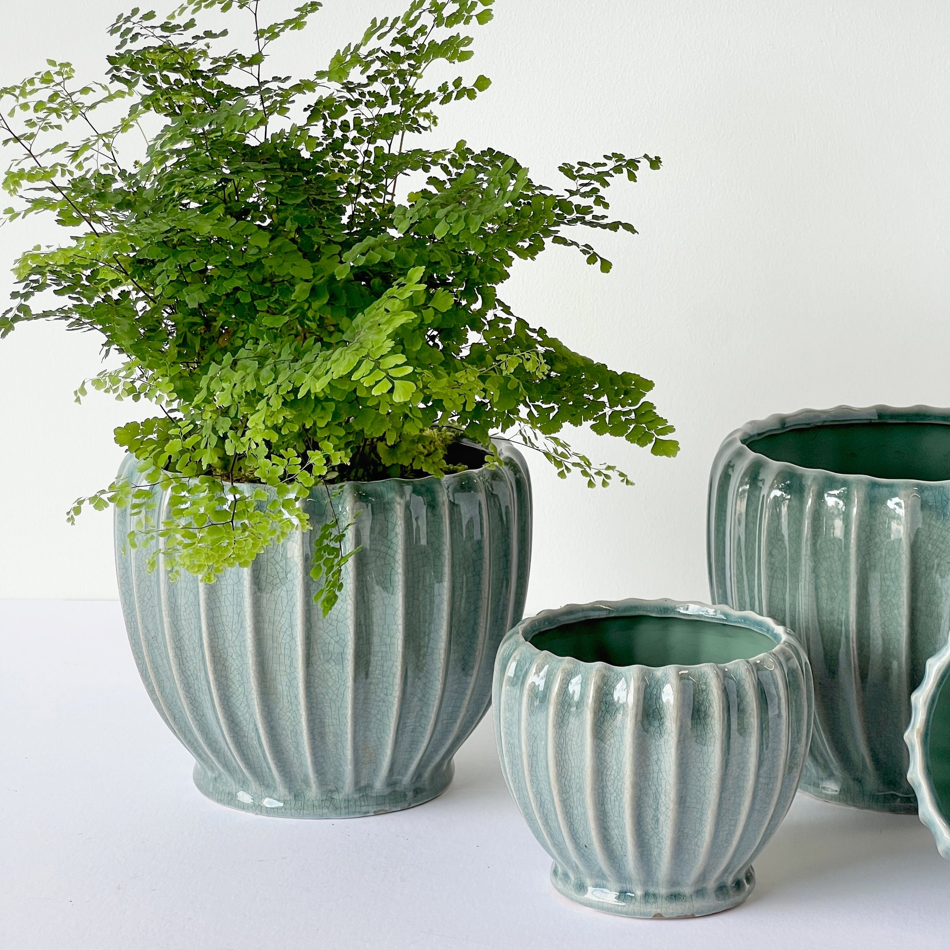 Crafted with a saturated glaze and sculpted ribbing, these cachepots have a drainage hole at the base to allow for outdoor use. When using indoors be sure to line the inside of the pot to protect the surface underneath from moisture. These cachepots should be protected from frost and freezing temperatures.