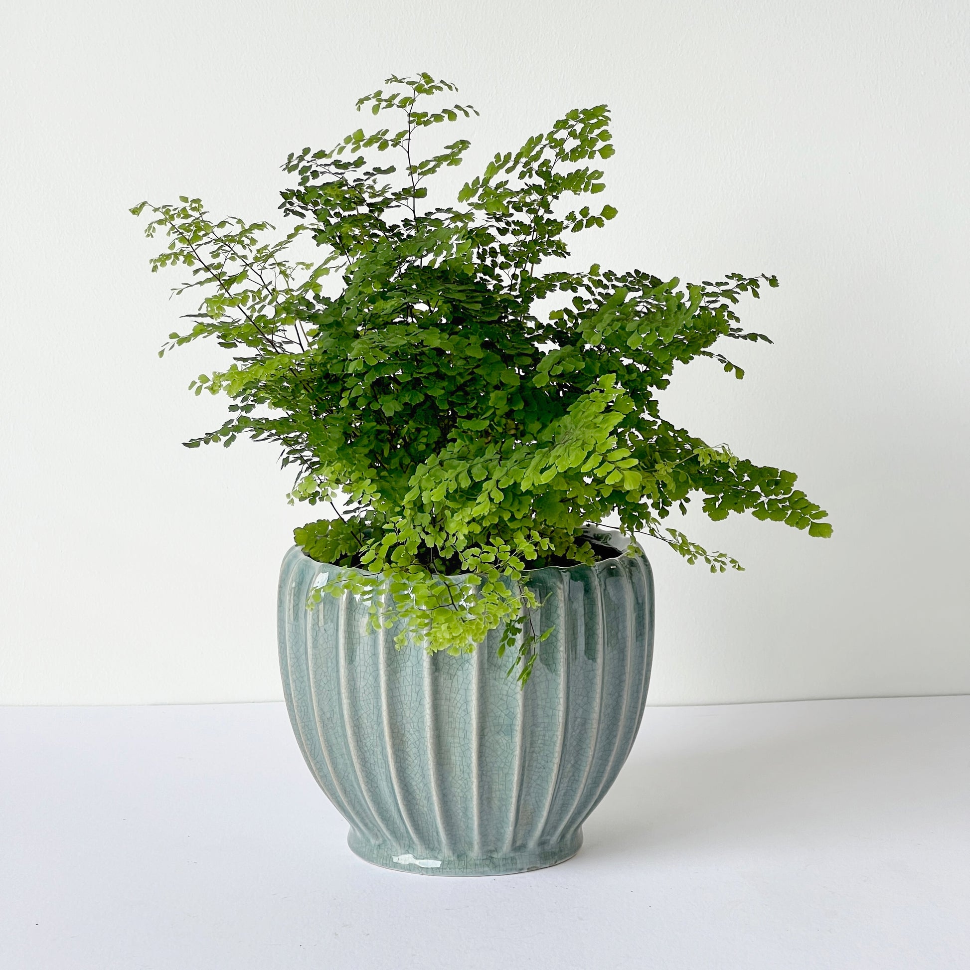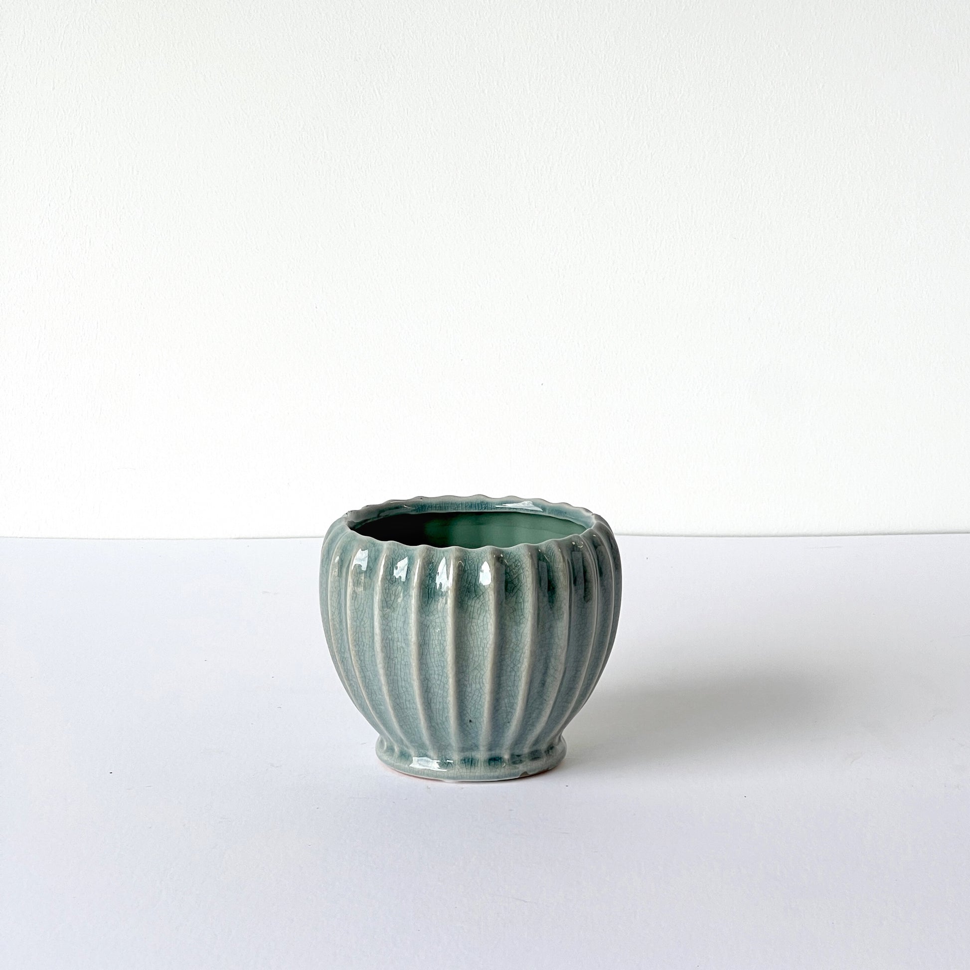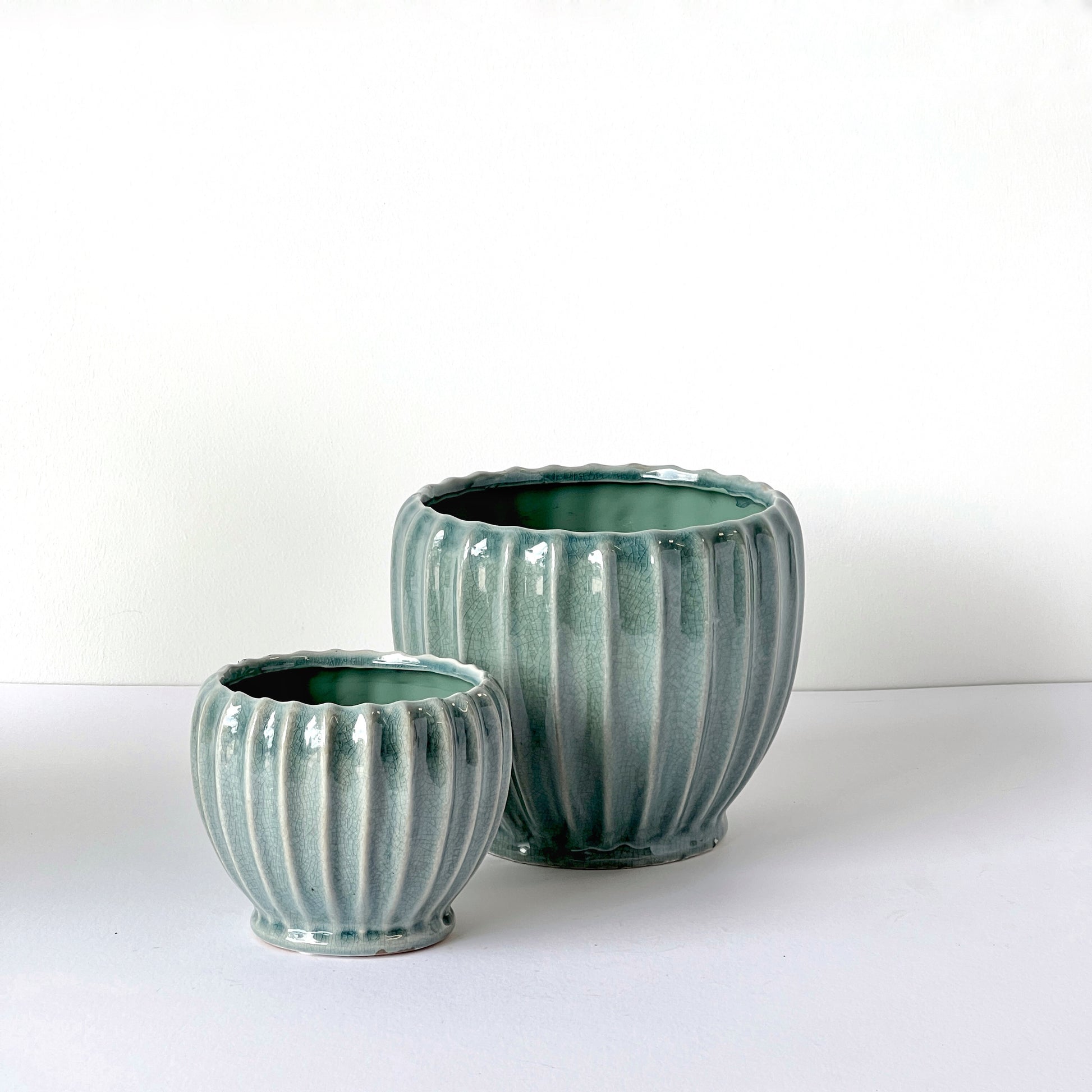 Crafted with a saturated glaze and sculpted ribbing, these cachepots have a drainage hole at the base to allow for outdoor use. When using indoors be sure to line the inside of the pot to protect the surface underneath from moisture. These cachepots should be protected from frost and freezing temperatures.