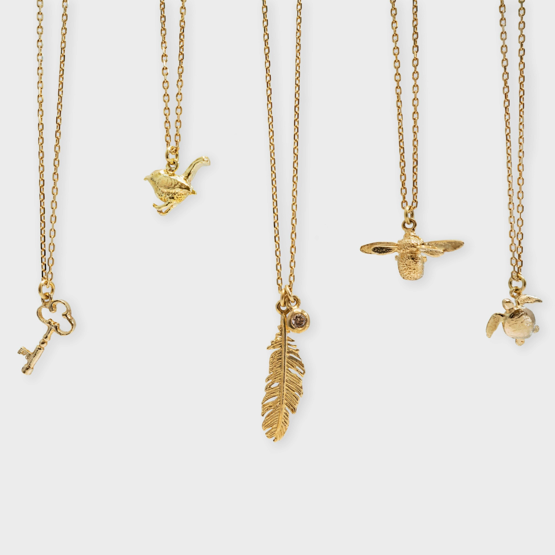 "Understated and intriquing, I adore these necklaces with subtle creatures each 18k Gold."